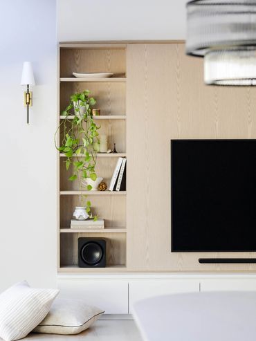 Custom joinery brings rhythm and cohesion throughout - crafted storage, built-in entertainment unit and subtle curves that soften edges and invite ease. The kitchen forms the heart of the home: a space for gathering, sharing, and slowing down, with natural stone and blackened brass details that glow softly under warm light.